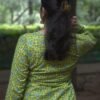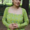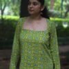 Full-sleeved kurta with mosaic-inspired patterns in green, yellow, and blue. Designed with a square neckline and structured silhouette, it blends modern elegance with artisanal charm.